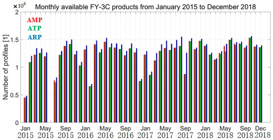 In this paper, four years of FY-3C RO data from 2015 to 2018 are used to evaluate the quality of refractivity, temperature, and specific humidity profiles. Figure 1 shows the numbers of monthly available products from January 2015 to December 2018. The numbers of products in most months are above 12,000, while it is as low as 8000 for some months. Data were missing for three months from June to August 2015. The numbers of ARP products are larger than that of ATP and AMP products, while the numbers of ATP and AMP are almost the same. The differences among the numbers of the three products are caused by quality control schemes implemented at each processing stage. If a retrieved profile cannot pass the quality control check, it will be rejected from the calculation of the next step.