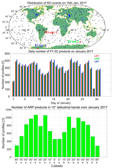 Global distribution of RO events on 15 January 2017 (top panel), number of daily products for January 2017 (middle panel) and numbers of FY-3C ARP products for January 2017 in 10° latitudinal intervals (bottom panel); the marked three stars are the three RO events for single RO performance illustrated in Figure 3.