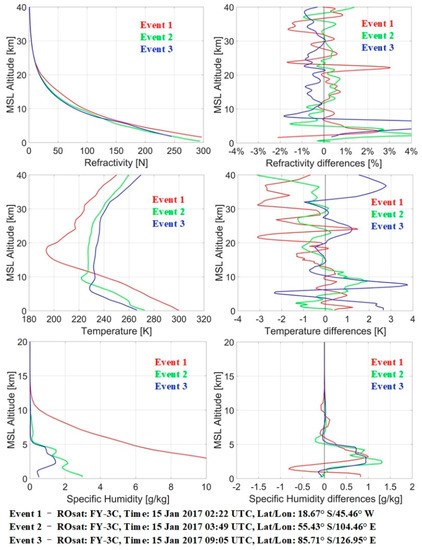 Figure 3 shows individual RO refractivity, temperature, and specific humidity profiles (left panels) and their corresponding difference profiles (right panels) of three exemplary RO events located in the tropical, middle latitudinal and polar regions of the southern hemisphere (see the red stars in the top panel of Figure 2). RO refractivity differences of all the three events are generally similar with differences varying within ±2% for most altitude levels from 10 to 40 km. Below 10 km, refractivity differences increase to be more than 4%. Temperature differences of all three events vary within ±2 K from 10 to 30 km. Above 30 and below 10 km, temperature differences are larger with values varying within ±4 K, and differences of Event 3 which locating in polar regions are largest among the three events. Specific humidity differences of Event 1 are largest due to its location in the tropics. The specific humidity difference of the three events are similar.