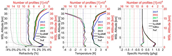 In Figure 4, temperature mean systematic differences of 2017 and 2018 are smaller than that of 2015 and 2016 due to an improved performance of retrieval algorithms of the FY-3C system. From 0 to 10 km, the systematic differences of 2017 and 2018 are within ±0.2 K and that of 2015 and 2016 are about than −0.5 K. From 10 to 25 km, temperature systematic differences show slight consistent negative values varying from −0.1 to −0.6 K. These negative differences are consistent with the findings in Xu et al. (2019) where they compared FY-3C temperature profiles with RS profiles. Above 30 km, systematic differences of temperature increase rapidly and exceed −4 K above 35 km. Temperature standard deviations of all years are generally within 2 K in the altitude range of 5 km to 30 km. Above a 30-km altitude, temperature standard deviations increase rapidly and also exceed 4 K above 35 km. The number of profiles of temperature and specific humidity are the same till the surface, while number of refractivity profiles decrease significantly below 5 km. This is because temperature and specific humidity are obtained using the 1DVar process, which combine RO observed information with prescribed background information. In the 1DVar process of FY-3C, if observed information were missing, background profiles would then be used to provide the optimal profiles directly. Since background profiles are always available till the surface, so the retrieved temperature and specific humidity profiles are also always available till the surface. Due to the increased dependence on the background values, the differences of temperature and specific humidity from ERA-Interim are more closely related to the background values rather than RO below 2 km in this study.