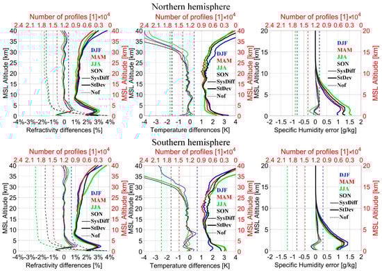Figure 6 shows the statistical errors of refractivity, temperature, and specific humidity in five latitudinal bands of 60° N–90° N, 20° N–60° N, 20° S–20° N, 20° S–60° S, 60° S–90° S. In middle latitudinal bands, i.e., 20° N–60° N and 20° S–60° S, the mean difference varies within ±0.2% above 5 km. Below 5 km, the differences increase and also show positive biases of about 0.7% from 2 to 5 km which are similar to the global statistics shown in Figure 4. Negative biases reaching about −1% are found at lowest few altitude levels. These negative biases are of similar magnitudes found by many other studies [42]. Standard deviations of these two latitudinal regions vary from about 1% at 10 km to about 3% at 40 km. Below 10 km, standard deviations increase to about 3% at 2 km and then decrease to 2% near the surface. In tropical regions, mean differences and standard deviations above 10 km are similar to that of middle latitudinal bands. However, below 10 km, strong positive differences are found from 3 to 10 km with values exceeding 2% with standard deviations exceeding 4%. These strong positive differences are consistent with the findings found by Liao et al. [42], but with slightly larger magnitudes. Below 2 km, the negative biases are smaller than that found by Liao et al. [42]. We cannot determine the exact causes of these small negative biases in tropical regions for now, further efforts are required. In the latitudinal band of 60° N–90° N, refractivity systematic differences show consistent negative values varying from −0.2% to −0.3%, while in 60° S–90° S, refractivity systematic differences show consistent positive values varying from 0.2% to 0.3%.