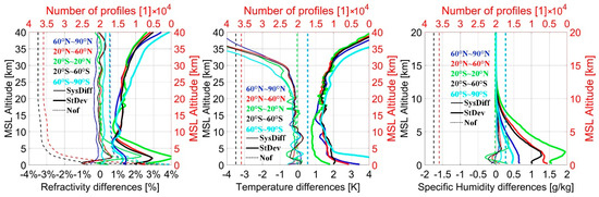 Systematic differences and standard deviations of FY-3C refractivity, temperature, and specific humidity profiles for the latitudinal bands of 60° N–90° N, 20° N–60° N, 20° S–20° N, 20° S–60° S, 60° S–90° S. Statistics are obtained by considering the FY-3C profiles in 2017. Dashed lines indicate the number of profiles (Nof) used for the corresponding latitudinal band.