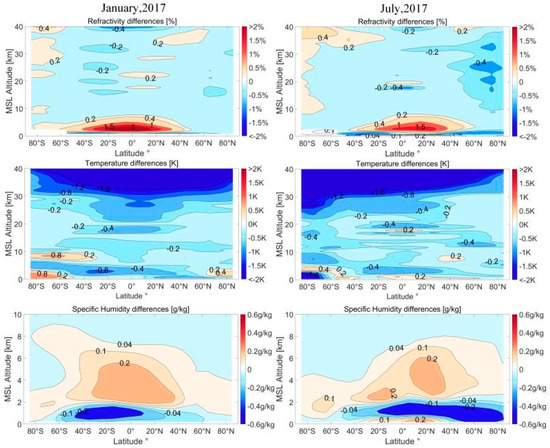 Latitudinal and altitudinal variations of systematic differences in refractivity (top panels), temperature (middle), and specific humidity (bottom) parameters in January and July of 2017.