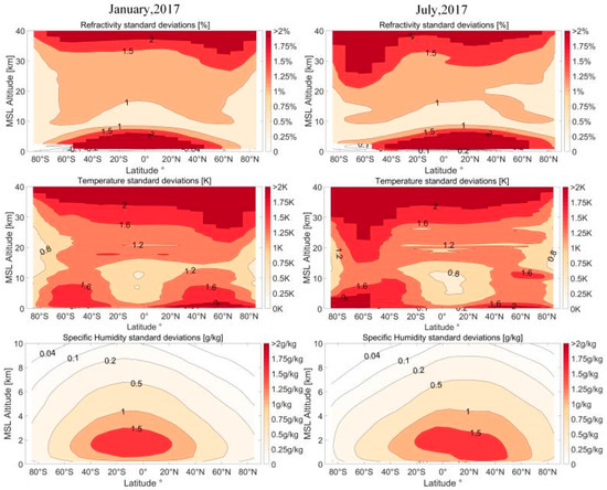 Latitudinal and altitudinal variations of standard deviations in refractivity (top panels), temperature (middle), and specific humidity (bottom) parameters in January and July of 2017.