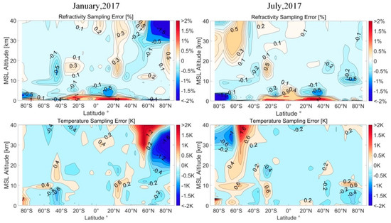 Refractivity and temperature sampling errors for January and July 2017 are presented in Figure 9. Sampling errors of specific humidity are similar to temperature errors and are therefore not shown. The figure indicates clear variations with respect to altitude, latitude, and season for both parameters. For each parameter, relatively higher sampling error amounts are obtained at the higher altitude around the polar region. Refractivity sampling errors for January 2017 are highest above the 30-km altitude and beyond 60° N with values exceeding −1.5%. In July 2017, error amounts for the same parameter are relatively highest from 20 to 40 km and exceed 0.5% beyond 60° S. Temperature sampling errors show similar characteristics as that of refractivity. Errors of January 2017 are largest above 20 km altitude beyond 60° N with values exceeding −1.8 K while it is largest above 30 km and beyond 60° S with values reaching −1.2 K for July 2017.
