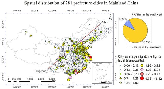 China is located in eastern Asia, which has an unbalanced urban development for cities in different regions. The administrative system has a hierarchical (nested) structure at different levels [32], which is composed of 2846 counties, 333 prefecture cities, and 34 provinces as reported in 2016. This hierarchical structure indicates that cities in developed provinces tend to have more opportunities for development than cities in underdeveloped provinces. In this study, a total number of 281 prefecture cities are selected from 30 provinces due to the unavailability of data in Tibet and the inconsistencies of statistics in Taiwan, Hong Kong, and Macau. As shown in Figure 1, the selected prefecture cities are distributed unevenly in space with different levels of average nighttime lights, and they account for 92.37% of the population and 91.62% of the GDP in Mainland China in 2016. Statistically, cities located in the southeastern division of the Aihui-Tengchong Line constitute around 90.76% of the total lights, while cities in the northwestern division occupy only 9.24%. This finding roughly coincides with population distribution in the two divisions, where 93% of population is in the southeast and only 7% is in the northwest. Thus, it is reasonable to select the 281 prefecture cities, and they can reflect the situation in Mainland China.