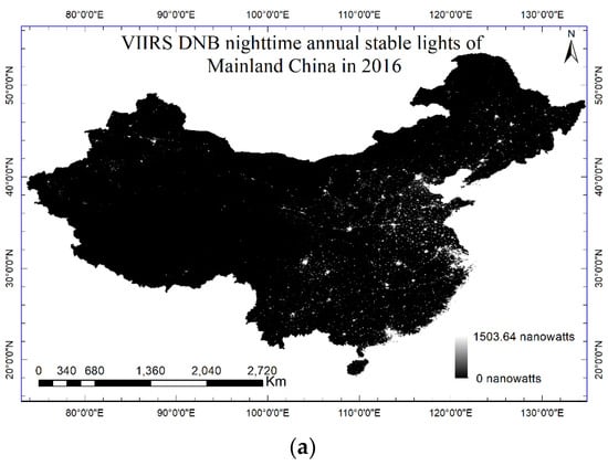 Human activities and their footprints on earth can be clearly observed in space through nighttime light imagery [1,2]. The widely used remotely sensed nighttime data are provided by the Defense Meteorological Satellite Program (DMSP)’s Operational Linescan System (OLS) and Suomi National Polar-orbiting Partnership (NPP) Satellite’s Visible Infrared Imaging Radiometer Suite (VIIRS) [3,4]. DMSP data have been used to map the global nighttime lights for many years [5], and the basic product is the annual cloud-free stable lights imagery, which is freely available from 1992 to 2013. However, DMSP data have been reported with several drawbacks. For instance, they have a relatively low spatial resolution, which could lead to unreliable estimation of city lights. They are recorded with a relatively low radiometric resolution, which could lead to saturation in urban areas and overglow near the city boundary [6]. Recently, VIIRS data have been released by the Earth Observation Group spanning from 2011. Compared to DMSP data, they appear to be much more promising, for instance, they have a finer spatial resolution of around 500 m, a larger number of 22 spectral bands, and a better radiometric resolution of 14 bits [7]. Importantly, they are radiometrically calibrated onboard, and they seem to be less affected by the problem of over-saturation in urban areas owing to an extended spectral coverage (from 500 nm to 900 nm) in the day/night band (DNB) [8,9]. Thus, VIIRS data can probably be regarded as a better proxy for anthropogenic development ([5,10]).