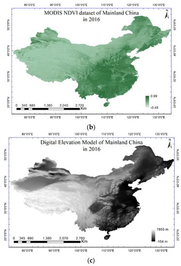 The Normalized Difference Vegetation Index (NDVI) dataset was downloaded for free from the platform of the Computer Network Information Center at the Chinese Academy of Science (http://www.gscloud.cn). It is a composite product (MODND1T) produced for China in 2016 at the spatial resolution of 500 m. NDVI is calculated using the blue, red, and near-infrared reflectivity bands of satellite imageries, and thus, it can reflect the characteristics of vegetation conditions. In this study, it was further clipped by the boundary of Mainland China. As shown in Figure 2b, there are around 99.31% of pixels with values larger than 0, and there are only 0.69% of pixels with values less than 0, which are mostly covered by lakes and snowy peaks.