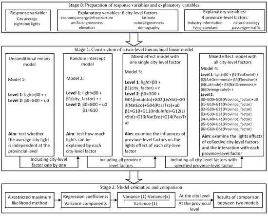 In addition, hierarchical linear models have been used to model the multi-level relationship of factors in many fields [28,29,30]. However, there are rarely studies using this method to examine the factors controlling nighttime lights. Therefore, this study aims to develop hierarchical linear models at two levels of city and province for a systematic and comprehensive analysis of a variety of anthropogenic and physical factors of nighttime lights for 281 prefecture cities in Mainland China, and particularly, it intends to explore the nighttime lights effect of cross-level factors. As aforementioned, city lights are not only relevant to the city’s anthropogenic and physical variables but are also affected by the diverse variables in the province where they are located. In other words, there are significant differences in the nighttime lights of different provinces [31]. This is highly consistent with the hierarchical (nested) structure of the administrative system in Mainland China [32]. Thus, the main contributions of this study are focused on the following two aspects, which are also the major differences from previous studies. (1) We conducted a systematic analysis of the nighttime lights effect of cross-level factors, which are derived from 12 city-level variables and 16 province-level variables. It is rarely reported in the literature by integrating all these uncorrelated factors into the same analytic framework. (2) We developed a two-level hierarchical linear model, which covers four types of models including the unconditional means model, random intercept model, mixed-effect model with one single city-level factor, and the mixed-effect model with all city-level factors. The results suggested the superiority of our model, and they can enhance our understanding of the mechanism underlying remote sensing of nighttime light, which will be valuable for socioeconomic studies.