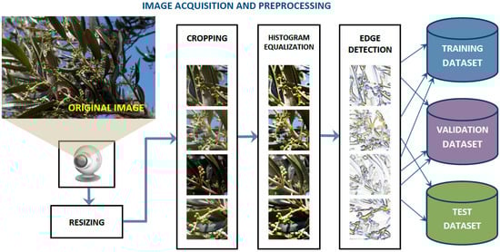 For the purpose of machine learning, six image patches (256 × 256 pixels) were extracted from the central part of each original image. This ensured a balanced dataset which consisted of 1400 images, showing details of the tree canopies during various phenological stages. Histogram equalization was applied to each image patch to reduce the effect of varying lighting conditions. Following that, edge detection algorithms were applied to the images with the goal of finding the most suitable variant for the experiment. All of the mentioned preprocessing steps are shown in Figure 1.