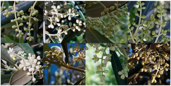 - Garcia-Mozo, H.; Orlandi, F.; Galan, C.; Fornaciari, M.; Romano, B.; Ruiz, L.; de la Guardia, C.D.; Trigo, M.M.; Chuine, I. Olive flowering phenology variation between different cultivars in Spain and Italy: Modeling analysis. Theor. Appl. Climatol. 2009, 95, 385. [Google Scholar] [CrossRef]