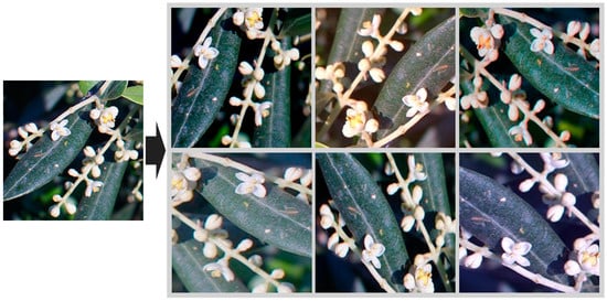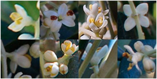 With the aid of an expert in this field, the images were classified as zero or one, depending on whether the start of the flowering phase was observed. Both classes have the same number of samples (700). Figure 2 shows examples of both classes (upper row—class 0, lower row—class 1).