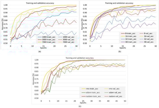 Traces of training and validation accuracy during custom CNN training with (a) different training dataset size, (b) different batch size and (c) different optimizers.
