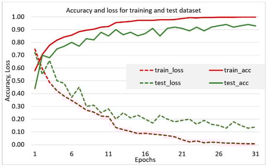Evolution of the accuracies and losses for training and test datasets are shown in Figure 7. The optimal architecture shown in Table 2 was used, applying the hyperparameters obtained by the experiments described in Figure 6.