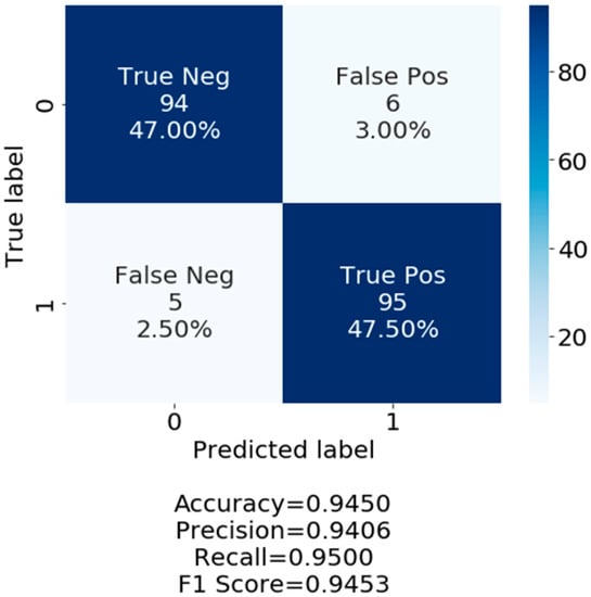 Figure 8 shows the confusion matrix, which summarizes the best classifier performance. As already mentioned, the accuracy is 0.9450. The model produced a similar number of false positives and false negatives, so the precision amounts to 0.9406, recall (sensitivity) is 0.9500, and the F1-score (the harmonic mean of the precision and recall) is 0.9453.