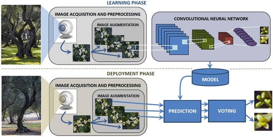 Our study assessed the efficiency of various models based on the CNN architectures in the context of the phenological state classification of plants—in this case, olive trees. The conducted experiment showed that the aforementioned classification can very efficiently be realized by using deep learning algorithms. The best results were reached with a custom VGG-inspired network, which includes 14 learnable weight layers, with the use of an augmented training dataset. The accuracy can be improved further by using data augmentation and majority voting procedures during the deployment phase, where the final classification accuracy amounts to 97.20%. This means that the entire process is viable and applicable under real conditions.