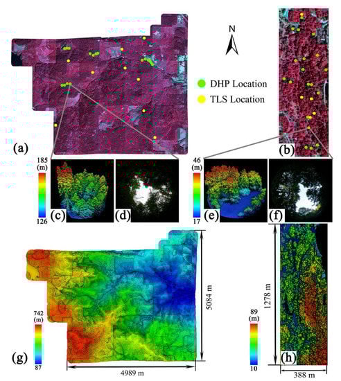 The study area. The subfigures (a,b) show the aerial false-color images and effective leaf area index (LAIe) measurement locations of the digital hemispherical photo (DHP) and terrestrial laser scanning (TLS) in the Washington Park Arboretum (WPA) and Panther Creek (PC) sites. The subfigures (d,c) show a DHP and the corresponding aerial laser scanning (ALS) data (circular forest plot with a radius of 30m) from the PC site. The subfigures (f,e) show a DHP and the corresponding ALS data (circular forest plot with a radius of 30m) from the WPA site. The subfigures (g,h) are the ALS data of the WPA and PC sites.