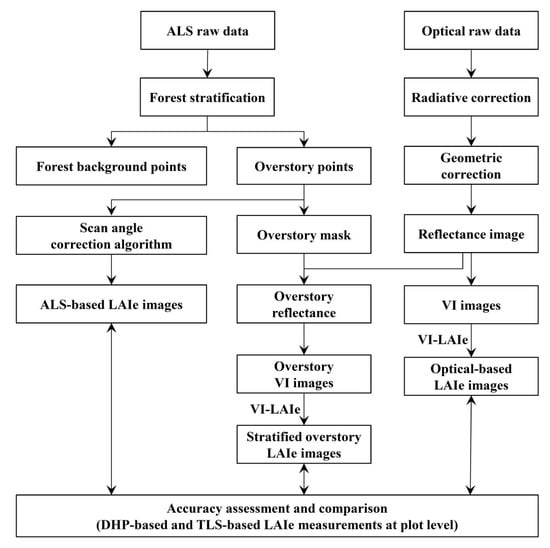 Flowchart of improving the forest overstory LAIe estimation by combining the aerial spectral and laser scanning data.