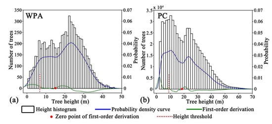 The tree height threshold was determined to stratify the forest overstory and background using the frequency histogram-based method (Figure 3). We first plotted the tree height frequency for the segmented tree crowns and obtained the double-peak probability density curves of the tree height distribution patterns in both the WPA and PC sites. By computing the first-order derivations of the tree height frequency curves, we determined the height stratification threshold as half of the tree height whose first-order derivative was zero and was the trough of the probability density curve (Figure 3).