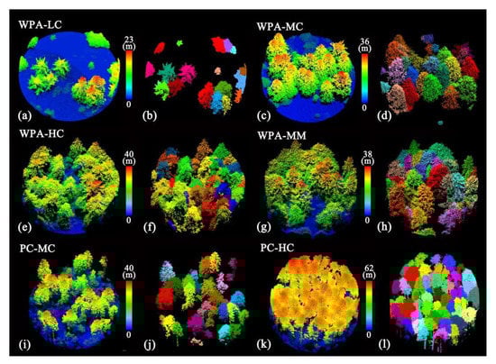Height-normalized ALS data (insets a,c,e,g,i,k) and corresponding tree segmentation results (insets b,d,f,h,j,l) of six circular forest plots with a radius of 30 m, including the WPA-LC, WPA-MC, WPA-HC, WPA-MM, PC-MC, and PC-HC. In the tree segmentation results, different colors represent individual trees.
