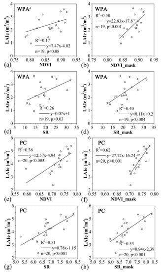 The linear regression statistical models of vegetation index and field-based LAIe in both the WPA and PC sites. (a) Normalized difference vegetation index (NDVI)-LAIe from the optical image in the WPA site. (b) NDVI-LAIe from the stratified forest overstory image in the WPA site. (c) SR-LAIe from the optical image in the WPA site. (d) Simple ratio (SR)-LAIe from the stratified forest overstory image in the WPA site. (e) NDVI-LAIe from the optical image in the PC site. (f) NDVI-LAIe from the stratified forest overstory image in the PC site. (g) SR-LAIe from the optical image in the PC site. (h) SR-LAIe from the stratified forest overstory image in the PC site.