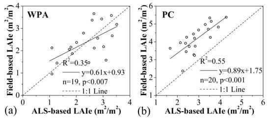 Comparison between the ALS-based LAIe values and the field-based LAIe values of forest plots in WPA (a) and PC (b) sites.