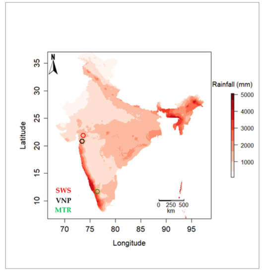 Map showing the location of the three study sites, Shoolpaneshwar Wildlife Sanctuary (SWS), Vansda National Park (VNP), and Mudumalai Tiger Reserve (MTR). The color gradient indicates decadal mean rainfall across the country.