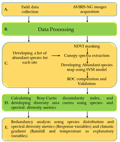 - Jha, C.S.; Fararoda, R.; Singhal, J.; Reddy, C.S.; Rajashekar, G.; Maity, S.; Patnaik, C.; Das, A.K.; Misra, A.; Singh, C.P.; et al. Characterization of Species Diversity and Forest Health using AVIRIS-NG Hyperspectral Remote Sensing Data. Curr. Sci. 2019, 116, 1124. [Google Scholar] [CrossRef]