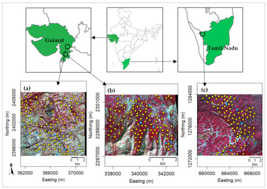 As part of a joint campaign between the Indian Space Research Organization (ISRO) and the National Aeronautics and Space Administration (NASA, USA), the AVIRIS-NG sensor was flown over a large number of sites in India between October 2015 and February 2016. AVIRIS-NG acquired data at wavelengths from 380 to 2510 nm with 5 nm spectral sampling. The sensor was flown on a King Air B200 at a 4000–8000 m elevation, with resulting pixel sizes of 4–8 m, depending on flight altitude. The spatial resolution of the AVIRIS-NG data of the three sites considered in this study was 4 m. The instrument measurements were calibrated and atmospherically corrected following Thompson et al. [38]. Airborne imaging spectroscopy data were subject to significant sun–sensor surface illumination effects due to both topography and anisotropic reflectance by vegetation. These were corrected following methods in Soenen et al. [39] and Wanner et al. [40] (code available at https://github.com/EnSpec/HyTools-sandbox) resulting in topographically and bidirectional reflectance distribution function (BRDF)-corrected images. Details of the AVIRIS-NG image data acquisition are given in Table 2.