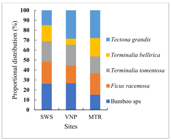A total of 123 tree species were recorded during field study at the three sites, of which 31 species were found to be common at all three sites. The recorded tree species richness was similar at VNP and SWS (68 and 70, respectively) but relatively higher at MTR (80 species). Amongst different the methods employed to estimate the species richness of each site, the Bootstrap method showed relatively closer values to the observed ones, as shown in Table S3. Estimates also showed a greater richness of species at MTR over the other two sites. A list of the common species at the three sites and the abundant species at each site are given in Tables S2 and S4. Species abundance data obtained from field plots was corroborated with observed distributions in larger polygons (Figure 2) laid down during field study, and were found to be matching. Log-based rank abundance curves of the abundant tree species, and all the recorded species of each site, showed variable width and similar slopes, indicating variability in the occurrence of these species (Figure S1). Lesser distributed species were in the lower part of the abundance curve, with many having the same rank. Site specificity was evident in the recorded tree species diversity, and the distribution of tree species, across the rainfall gradient. The most abundant and common tree species across three sites were Ficus racemosa, Tectona grandis, Terminalia bellirica, and Terminalia tomentosa. Bamboo (Dendrocalamus strictus at SWS and VNP and Bambusa bambos at MTR) was the fifth most common abundant species at the three sites. The relative distribution of common abundant species and their hierarchy, as seen in the abundant species maps, was not the same at the three sites (Figure 4). The distribution of T. grandis increased with an increase in rainfall, while bamboo species showed a reverse trend. T. bellirica showed lesser spread at VNP, while T. tomentosa showed higher spread, indicating intra-genus inconsistency in spread.