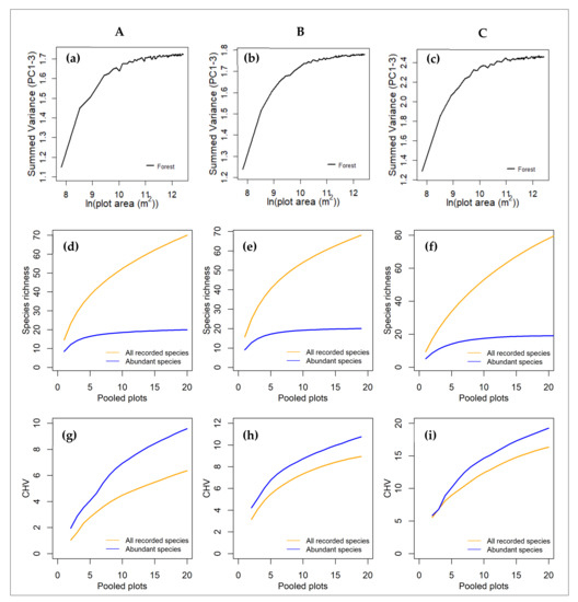 Diversity area curves (A: SWS, B: VNP, C: MTR). Spectral diversity–area curves for the summed variance of 175 plots (a–c); Species diversity–area curves (d–f); Cumulative CHVs and area curves (g–i).