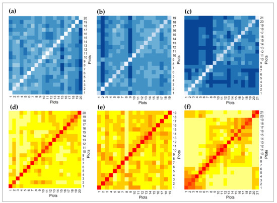 Heatmap of Bray–Curtis dissimilarity graphs of abundant species. The mean dissimilarity value of species abundance (blue) and that of spectral diversity as CHVs (yellow) are (a) 0.64 and (d) 0.81 for SWS, (b) 0.56 and (e) 0.68 for VNP, and (c) 0.81 and (f) 0.81 for MTR.
