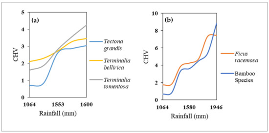 The abundant species maps developed from AVIRIS-NG datasets were found to be very useful in finding the intra- and inter-spectral variability of species spread over ~80% of cover at all three sites. The CHV values of the sets of 50 spectra of each common abundant species from each of the 0.05° CHIRPS grid cells across rainfall gradient showed that rainfall has a positive effect on intra-species CHV values, indicating a dynamic range in their functional diversity. CHVs increased over rainfall gradient consistently across the sites (R2 0.86–0.98). Across species, CHV variability was relatively narrow for T. grandis (Figure 9) and substantially higher for F. racemosa and bamboo species. Inter-species variability was found to be relatively higher at MTR (Figure S4).