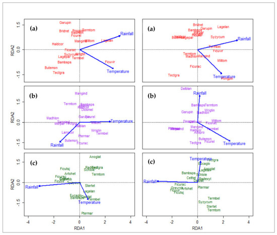 To look at the impact of climatic gradient on the tree species diversity, distribution, and spectral diversity of the three sites, redundancy analysis (RDA) was performed. RDA is a constrained ordination technique that directly relates the relative abundance of species across environmental gradients [41] and allows for establishing relationships between observed gradient of abundances vis-à-vis environmental drivers considered here as a climatic (rainfall–temperature) gradient. Analyses were performed using field plot data, the CHVs of plots for all recorded species, and abundant species (response variables) against recorded climatic gradient (explanatory variable).