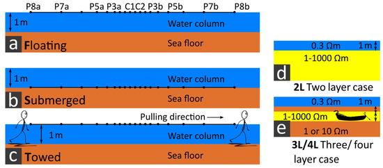 Furthermore, we use modelled datasets of a two-layer (2L) case (Figure 1d), representing an integral sea bottom/sediment rock resistivity, and a three- and four-layer (3L/4L) case (Figure 1e) representing possible thin layers embedded in the sea bottom, e.g., an archaeological object in the sea floor. The specific resistivity of the water column corresponds to brackish water of the Baltic Sea. For the 2L case, we usually assume a water column of 1 m, which for some investigations we vary from 0.2 to 2 m. The specific resistivity of the second layer was varied from 1 to 1000 Ωm. This includes materials such as fully saturated clay and sand (saturation of 1) of about 1 Ωm [14]. Porous, weathered rocks, e.g., limestone, show specific resistivity values of about 100 Ωm, whereas un-weathered rocks such as granite are up to 1000 Ωm [14]. Another possible field of application is the upwelling of groundwater below the sea floor. According to Archie’s law [15], freshwater-saturated sand shows a specific resistivity of about 100 Ωm.