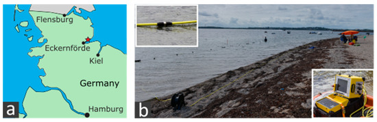 (a) Location of Eckernförde Bay in Germany, (b) profile using setup F in Eckernförde Bay, Baltic Sea, Germany. Ranging poles mark the profile of 40 m length in which the 20 m long, inverse Schlumberger multi-electrode streamer is positioned. The RESECS (Resistivity Electrode Control System) multi-channel geoelectric unit [13] and stainless-steel electrodes are shown in detail.