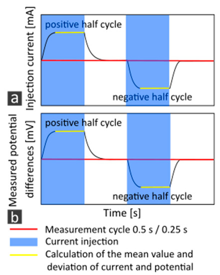 Sketch of a geoelectric measurement cycle, showing (a) the strength of the injected current and (b) the measured potential differences with time within the time window of two half cycles. The red line describes the full length of either 0.5 or 0.25 s used for the measurements. The blue box highlights the time interval of current injection. The yellow line shows the interval for the calculation of the mean measured value of current and potential, from which the standard deviation is given, defining the measurement noise.
