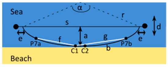 Figure 4. Simplified drawing of measurements carried out parallel to the coastline, causing a deflected streamer, approximated by the height of a small circle segment. α is the center angle of the arc, r is the circle radius, b is the length of the streamer, s is the secant, a is the orthogonal displacement from the midpoint and e is the relative inline displacement. C1 and C2 are the current electrodes, P7a and P7b are the potential electrodes, f is the distance between P7a and C1 respective to P7b and C2 and g is the distance between P7a and C2 respective to P7b and C1.From this, the geometry factor k can be calculated from the symmetrical distance of and (Figure 4) for floating electrodes:and for submerged electrodes using the mirror source technique, depending on the water depth tw:The uncertainty for the apparent resistivity of an electrode pair results from the difference of the geometry factor for the straight and deflected cable and the arithmetic mean value for the repeated measured current and voltage. - (d)