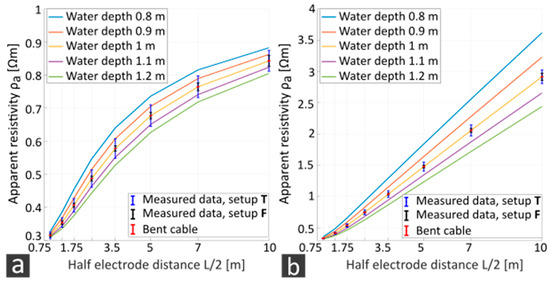 In the next step, we investigated possible uncertainty sources. Table 4 summarizes three assumed error components for the exemplary electrode pair P7a–P7b, with L/2 = 7 m for all measurement setups. The noise was derived from the field measurements, whereas deviations due to streamer deflections and water-lever variations were theoretically estimated. With relative uncertainties of approximately 1%, 2% and 5% for setup S, F and T, the noise is equal to the average measurement accuracy for the electrode pair P7a–P7b. Thus, for larger electrode layouts, we assume that other sources of error will only contribute to the maximum recorded uncertainties. For the shortest layouts (L/2 = 0.75 m), as an example, the noise for setup F is 0.3%, so that other sources of error are more evident here. Figure 7 compares measurement uncertainties of setup F from field data shown in Figure 6 and Table 2, with theoretical uncertainty calculations based on estimations made in Section 2.2.1, including water-level variations and streamer deflections. The effective water-level variations are shown by colored vertical electrode sounding (VES) curves and appear to affect the apparent resistivity values more than streamer deflections (Figure 7, red error bar, relative errors of 2%). The influence of water-level variations on the apparent resistivity increases with increasing subsurface layer resistivity (compare Figure 7a, computed for 1 Ωm, and Figure 7b for 100 Ωm). Measurement uncertainties obtained from the repeated profiling with setup T (Figure 7, black error bar) are within the range of effective water-level variations of 10 cm for a subsurface resistivity of 1 Ωm, and uncertainties of stationary measurements (Figure 7, blue error bar) are even smaller. Compared to the calculated water-level variations on a subsurface resistivity of 100 Ωm, the measured uncertainties are of little weight. Thus, we assume that water-level changes occur locally and do not change the total water column, as considered in the calculation. On the contrary, for resistivity values ~ 1 Ωm, the height of the water column might be incorrectly determined by ±10 cm due to measurement uncertainties. Since Table 4 includes the maximum possible impact of water-level variations and cable deflections, the estimated measurement uncertainties are significantly higher than the observed uncertainties. As observed with the repeated field measurements, setup T shows the largest uncertainties followed by setup F and setup S.