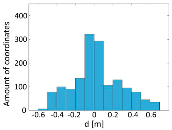 Histogram of GNSS (global navigation satellite systems) coordinate deviations, d, of all towed profiles from the average measurement profile calculated from a regression curve of the coordinates.