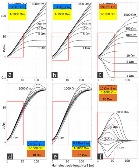 In order to understand the characteristics of geoelectric measurement curves in shallow water, we calculated Schlumberger sounding curves comparing shallow-water and onshore settings. To approximate sediment and rock below a water layer, we have defined three possible 2L scenarios (Figure 5a–c). They correspond to shallow water (Figure 5a,b) and to onshore settings (Figure 5c). The shallow water settings are based on the 2L case shown in Figure 1, with a brackish water column of 1 m depth and a second layer of material varying from saturated clay to granite. Specific resistivity values from 1 to 1000 Ωm were chosen in irregular steps. Offshore archaeological features are often sanded in shallow depth underneath the seafloor (see also Figure 1e). Targets such as wrecks or harbor constructions may extend horizontally over several meters, but much less in depth. This motivated us to make an attempt to assess the arrays’ ability to locate this type of target. Therefore, we have defined three 3L cases (Figure 5d–f), again comparing shallow water (Figure 5a,b) and onshore settings (Figure 5c). Here, we included a 1 m thin sea-bottom layer over a half-space thought to represent an archaeological feature. The third layer satisfies the criteria for moistened sand. In the onshore scenario, the 1 m thick water layer was replaced by moistened sand, and the other layer parameters were kept constant. The measurement configurations selected were setup F (Figure 5b) and S (Figure 5c) for shallow water settings. For the onshore settings, electrodes at the surface were used. The formulae for computing theoretical sounding curves were derived for the Schlumberger configuration. However, because of the reciprocity theorem, they also apply to the inverse Schlumberger configuration. They are given in the Appendix A, where floating and submerged electrodes are differentiated.