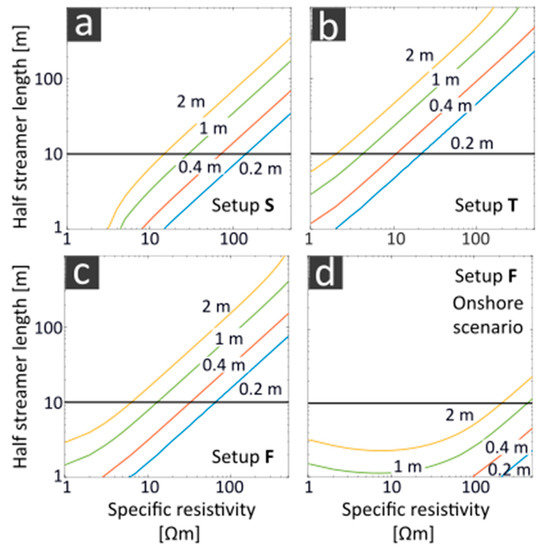 Figure 11 shows the required streamer length to resolve the specific resistivity of the subsurface in a shallow water 2L case with a tolerance of 100% considering the measurement uncertainty. Variations of the water column from 0.2 to 2 m and the differences of the setups S, F and T were evaluated. There is a significant difference between the shallow water scenario (Figure 11a–c) and the onshore scenario (Figure 11d). In the onshore scenario, specific resistivity values > 100 Ωm with a surface layer thickness up to 2 m can be resolved with our electrode array of 20 m length. In the shallow water scenario, a specific resistivity of about 10 Ωm can be well resolved in water depths depending on the measurement setup (0.4–2 m). The required streamer length increases with increasing resistivity contrast from the bottom to the top layer. In the onshore scenario, this increase can be observed from a specific resistivity of 10 Ωm. In contrast, due to the top layer of 10 Ωm, for specific resistivity values of 1–10 Ωm, there is a little decrease in the required streamer length. Furthermore, for the shallow water scenarios, setup S can resolve a specific resistivity that is seven times lower than setup T for an equal streamer length and water depth. A duplication of the water depth requires twice the streamer length in order to resolve the same specific resistivity values.