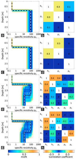 Left column: Model results from the stochastic inversion, color-coded by their misfit values and normalized to the relative misfit of 14%. The black line represents the true model, and the white dashed line represents the expected model. Right column: normalized correlation matrix of the subsurface parameters. (a,b) Case 2L and setup F, (c,d) case 2L and setup S, (e,f) case 3L and setup F as well as (g,h) case 3L and setup S are distinguished.