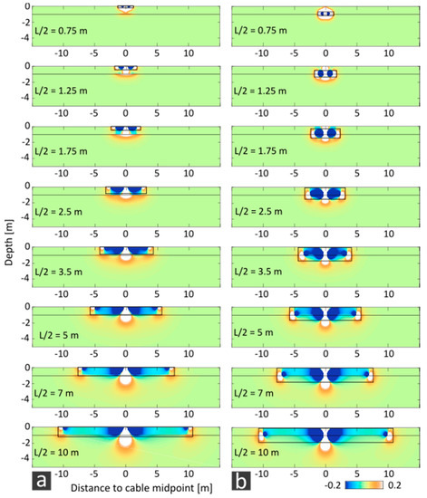 For electrodes at the surface, the potential V can be calculated by using the half-space formulas (see Appendix B). For submerged electrodes, the full-space formulas for the potential V (see Appendix B) and the mirror source technique have to be used: