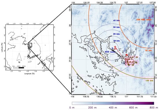 The Gwangdeoksan radar (GDK) is located close to Seoul, at 45.12 km northeast of the KICT radar. This single-polarization S-band weather radar (DWSR-8501S/KSDP, EEC, USA) has been operated by the Korea Meteorological Administration (KMA) at Hwacheon-Gun, Kangwon-do province (38.1173° N, 127.4336° E), Korea, since 2003. It collects volume scan data every 10 min and has a frequency of 2887 MHz with horizontal polarization, an effective observational range of about 240 km, and a spatial resolution of 1° × 240 m. Quality control is applied to radar data by KMA [17]. ZH was retrieved at elevation angles of 0°, 0.3°, 0.6°, 1°, and 1.7° to compare the attenuation correction of KICT reflectivity. The main specifications of the KICT radar are listed in Table 1 along with those of the GDK radar.