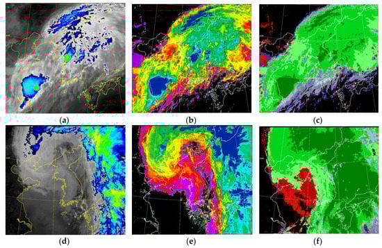 (a) Rainfall Intensity (RI), (b) Cloud Top Height (CTH), and (c) Cloud Type (CT) during convective rain occurring at 23:15 LST, on 5 July 2016. and (d) RI, (e) CTH, and (f) CT during stratiform rain occurring at 15:30 LST, on 3 May 2016 (provided by the National Meteorological Satellite Center).