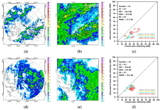 The distribution of at 22:00 LST on 2 May 2016, for a single scan after using SMLm shows that the results of MMLm are lower than for the convective rainfall case (Figure 8a,d). Following SMLm, the X-band radar reflectivity slightly increased, and minimal changes were observed in the reflectivity textures (Figure 8b,e). In addition, the statistical scores were based on, e.g., ME, MAE, and RMSE decreased and BS increased. ME decreased from −8.8 dB to −6.1 dB, MAE decreased from 8.9 dB to 4.9 dB, BS increased from 0.7 to 0.9, and RMSE decreased from 10.3 dB to 5.9 dB (Figure 8c). These results show that the attenuation-corrected reflectivity in the stratiform rainfall case seemed to be relatively more consistent for S-band radar reflectivity than the corrected reflectivity in the convective rainfall case because stratiform rainfall has more homogeneous and weaker rainfall echoes.