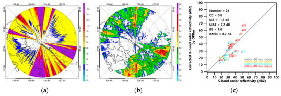 Chandrasekar et al. [14] reported that under Rayleigh scattering assumptions, radar reflectivity will not change in accordance with the radar frequency. However, the Rayleigh scattering assumptions are not strictly valid with respect to X-band. Hence, we converted the S-band radar reflectivity to the intrinsic reflectivity in the X-band using an empirical conversion method [15] and changed the elevation angles of the S-band radar from 0° to 1.68° to identify the smallest differences between radar beam heights.
