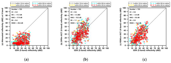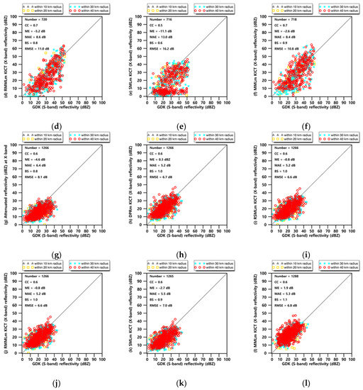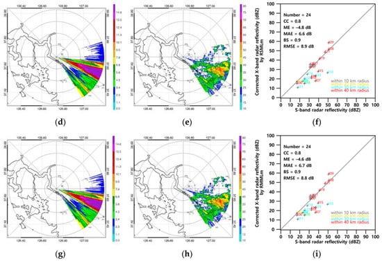 Figure 6b,e,h show the X-band radar reflectivity field at 22:00 LST on 2 May 2016, for a single scan after using each attenuation field of DPRm, RSMLm, and RMMLm (Figure 6a,d,g, respectively). The maximum corrected X-band reflectivity was approximately 33 dBZ, whereas the corresponding S-band reflectivity was approximately 38 dBZ. Although the effectiveness levels of the attenuation correction methods were mostly similar to the stratiform case, the CCs were lower and other statistical scores were superior in the convective case (Figure 6c,f,i). The statistical scores between RSMLm and RMMLm are almost identical because the optimal determined by RSMLm and the optimal determined by RMMLm are same at this time. In the case of the stratiform rainfall, the attenuation was not large because of homogeneous and weak rainfall echoes.