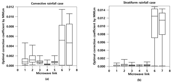 Figure 9a shows box-whisker plots for , which was determined by the MMLm during the convective rainfall case. From 10:21 to 14:50 LST on 5 July 2016, 24 volume scan data were collected by the X-band radar. Furthermore, Figure 9b shows determined by the MMLm during the stratiform rainfall case. From 19:21 LST on 2 May 2016, to 08:50 LST on 3 May 2016, 52 volumes of scan data were collected by the X-band radar. Each individual optimal was determined using the MMLm within 0.001–0.014. The range of correction coefficient for microwave links 6 and 7 were higher than those of other microwave links. This is because links 6 and 7 have the shortest link path, and the distance between antenna (transmitter and receiver) and KICT radar is long. Leijnse et al. [34] stated that if most of the variation in rainfall occurs within a link, then the relation between specific attenuation and rainfall rate will have to be close to linear. The typical spatial scales are relatively distributed in ranges below 8 km [34]. The distribution of the optimal was consistent with the variation range used in a previous study [5].